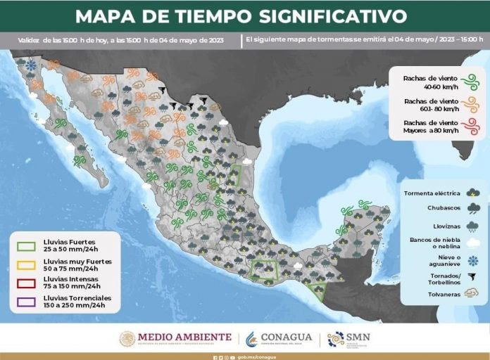 Para esta tarde-noche de jueves 4 de mayo, el pronóstico indica la posibilidad de lluvias aisladas en las zonas norte y noroeste del estado de Chihuahua, sobre los municipios de Ahumada, Temósachic, Moris, Uruachi, Ocampo, Bocoyna, Guerrero y Maguarichi; además de vientos con rachas de hasta 55 kilómetros por hora en Janos, Guachochi, Balleza y Nonoava.