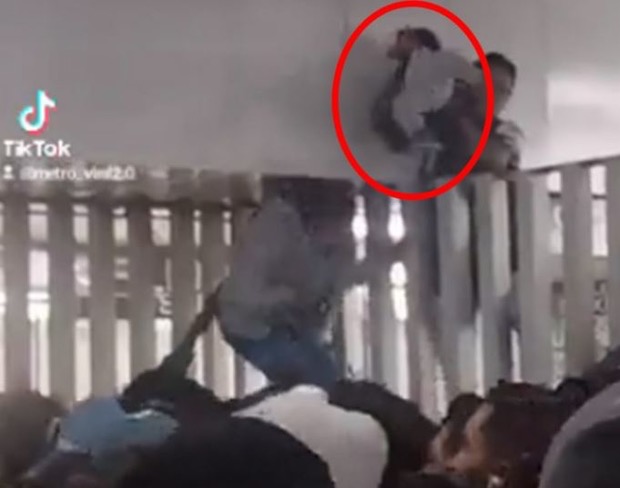 En el video que circula en redes sociales se puede observar al papá cómo carga a su bebé, le eleva en sus brazos y se lo entrega a un elemento de seguridad que se encuentra al otro lado de la reja.