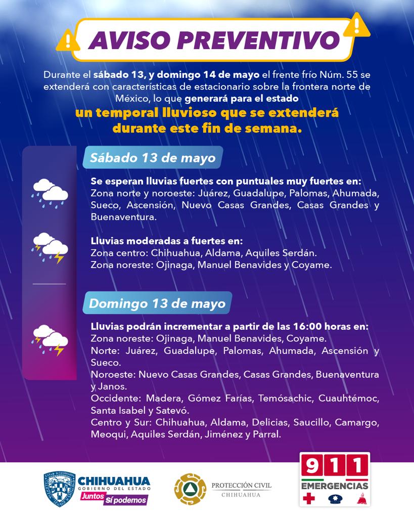 Chihuahua.- La Coordinación Estatal de Protección Civil (CEPC) emitió un aviso preventivo para el territorio estatal debido a la llegada del frente frío número 55, el cual se mantendrá estacionario sobre la frontera norte durante los días viernes 12, sábado 13 y domingo 14 de mayo, y generará un temporal lluvioso que se extenderá durante este fin de semana.