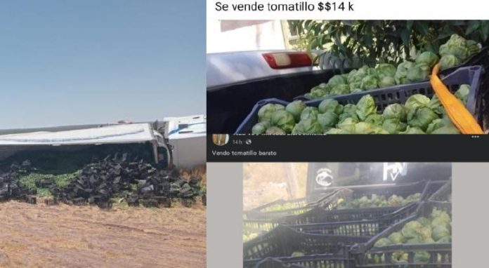 Chihuahua.- En las redes sociales varias personas comenzaron a vender en los grupos las redes de tomatillo que rapiñaron de un tráiler que se volcó en la carretera a Jiménez el 10 de mayo. Las están vendiendo hasta en 50 pesos la arpilla.