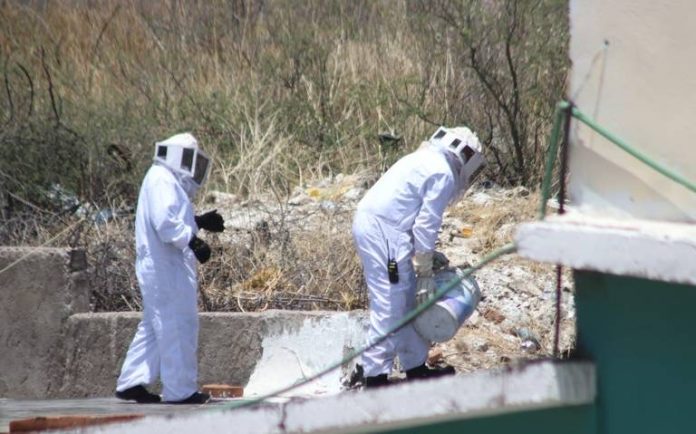 Los bomberos se colocaron el equipo correspondiente para controlar la situación con las abejas, mismas que se encontraban en un terreno baldío.