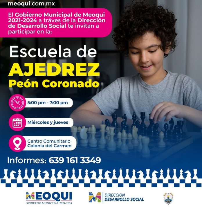 Meoqui.- Este miércoles arranca el nuevo curso de Ajedrez en Meoqui, donde impartirán clases de este deporte a niños, niñas y jóvenes en el Centro Comunitario de la Colonia del Carmen de 5:00 a 7:00 PM, por lo que el Gobierno Municipal a través de Desarrollo Social hacen la invitación extensiva para que se inscriban a la Escuela de Ajedrez Peón Coronado con un costo de 100 por clase.