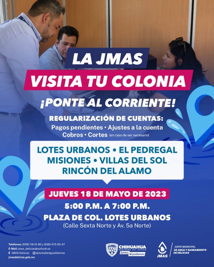 La atención por parte del equipo de la JMAS Delicias, será en un horario a partir de las 5 de la tarde en la plaza principal de la colonia, por lo que se invita a los usuarios de Lotes Urbanos, así como fraccionamientos aledaños como; Campo Real, Del Real, Pedregal, Las Misiones, Villas del Sol, Rincón del Álamo, entre otros, a que aprovechen los beneficios del programa.