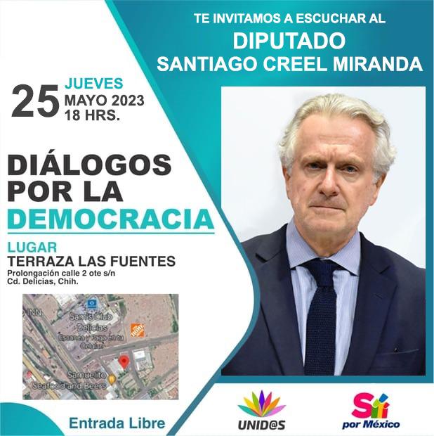 Uno de los aspirantes a la candidatura de Va por México a la Presidencia de la República, Santiago Creel Miranda, estará en Delicias el próximo jueves 25 de mayo.