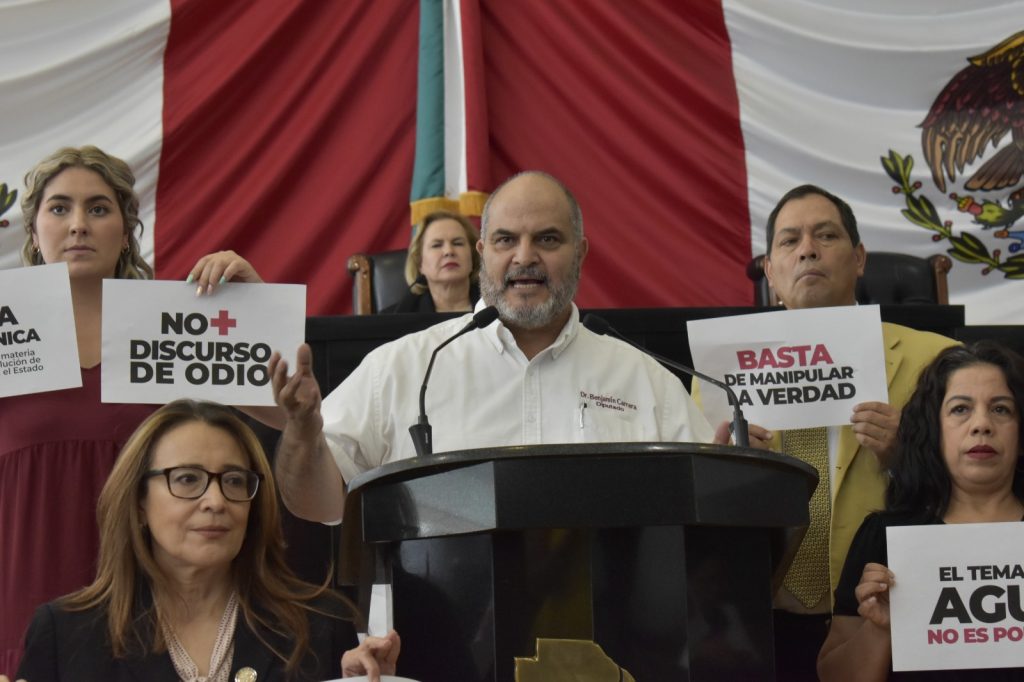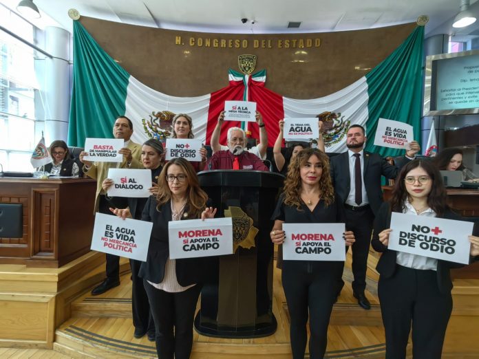 Chihuahua.- Los diputados de morena en el Congreso del Estado, manifestaron su rechazo a los argumentos del PAN y el PRI, respecto al tema del agua de las presas federales en la entidad, donde intentan revivir un discurso de polarización y diatriba en contra del Gobierno de México y morena.