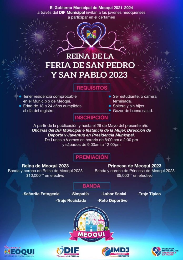Meoqui.- Con premios de 10 mil y 5 mil pesos en efectivo para el primer y segundo lugar, en Meoqui lanzaron la convocatoria para elegir a la Reina San Pedro y San Pablo 2023, la cual está organizada por el Gobierno Municipal, DIF Municipal, la Instancia Municipal de Atención a la Mujer y el Instituto Municipal del Deporte y Juventud, quienes hacen extensiva la invitación a las jóvenes meoquenses para inscribirse a este certamen, a partir de la publicación con fecha límite hasta el 26 de mayo.