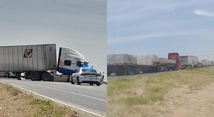 Delicias.- Un accidente vial que involucró a un tráiler que quedó “encampanado” en la carretera a Delicias, generó un caos vial en la zona, por lo que fue necesaria la presencia de elementos de la Guardia Nacional para atender el hecho.