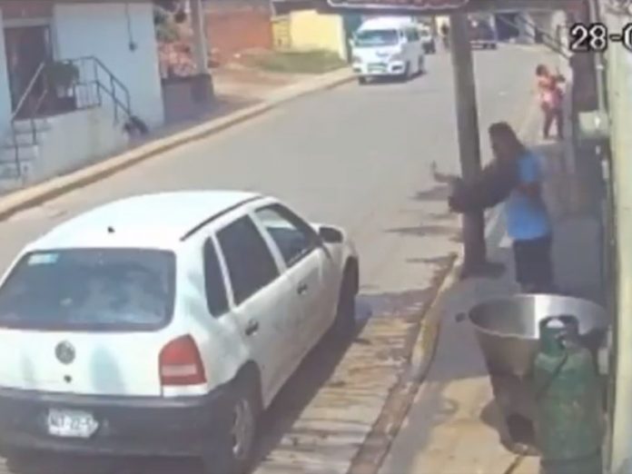 En las imágenes se ve a dos perros en la calle acercándose al local donde se encuentra la cazuela. Segundos después una persona con playera azul sale del establecimiento y agarra a uno de los perritos para inmediatamente arrojarlo a la cazuela.