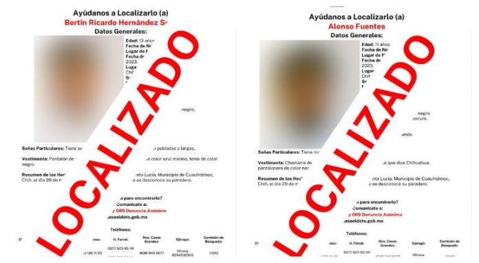 Cuauhtémoc.- El día de ayer, la Fiscalía General del Estado se compartió la pesquisa en la que solicitaban ayuda para encontrar a Alonso Fuentes y Bertín Ricardo Hernandez Soto, dos niños de 11 y 13 años de edad respectivamente y que desaparecieron en la ciudad de Cuauhtémoc, Chihuahua y hoy compartieron que fueron encontrados con vida.