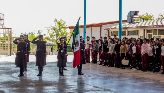 Delicias.- Con la firme intención de promover los valores cívicos y de fomentar el desarrollo de los jóvenes, el Presidente Municipal, Jesús Valenciano, acudió a las instalaciones del CBTa 2 de Delicias, para rendir honores a la Bandera, acompañado de estudiantes de este bachillerato.
