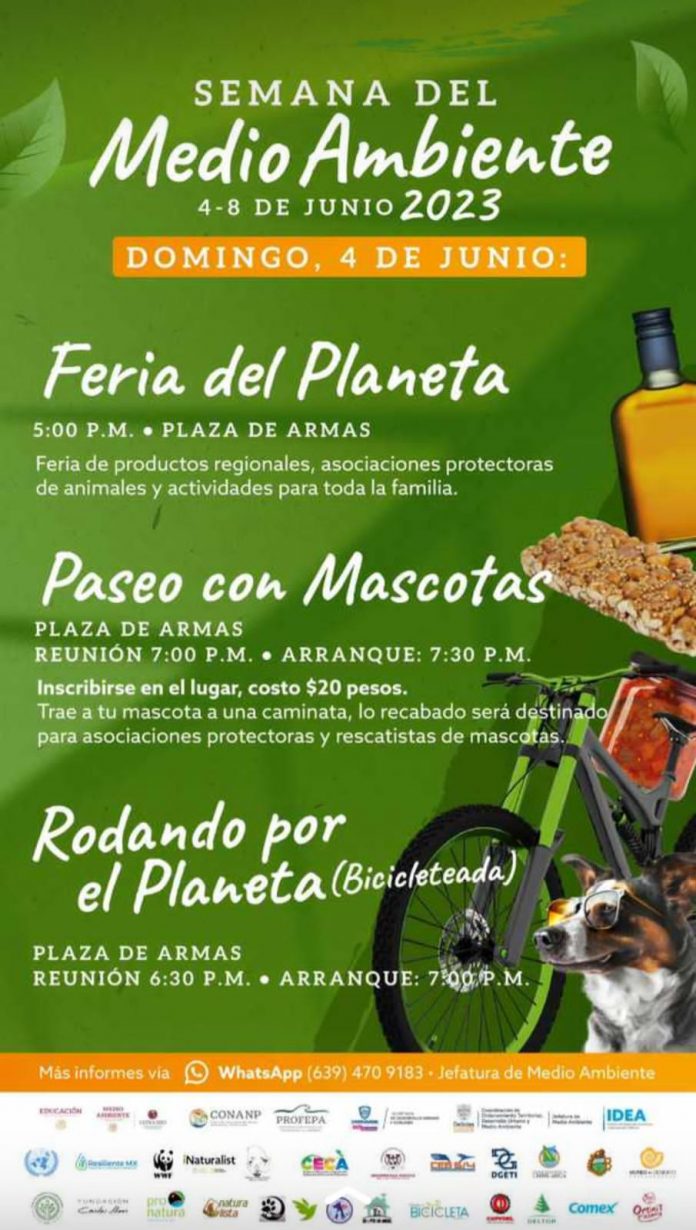 Así lo dio a conocer Juan Torrecillas, jefe de Medio Ambiente, quien además mencionó que los eventos son diversos y para toda la sociedad; explicó se iniciará el 04 de junio con la “Feria del Planeta” en la Plaza de Armas, la cual consistirá en la exposición de productos regionales, asimismo invitó a la ciudadanía al paseo con mascotas que arrancará a las 7 y media de la tarde en este mismo recinto, detalló que el costo de recuperación de 20 pesos y que todo lo recabado se destinará a las diferentes asociaciones Protectoras de Animales.