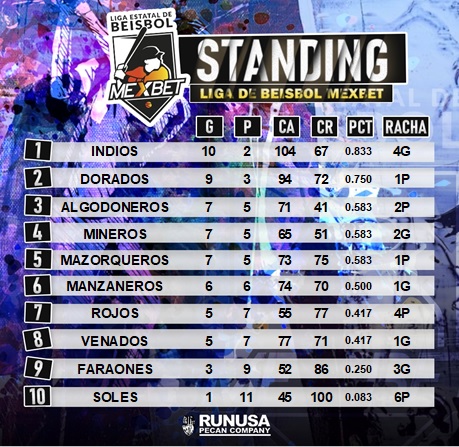 Con este triunfo, Indios asumen el liderato de la liga Estatal MEXBET 2023, con récord de 10-2, en ganados y perdidos.