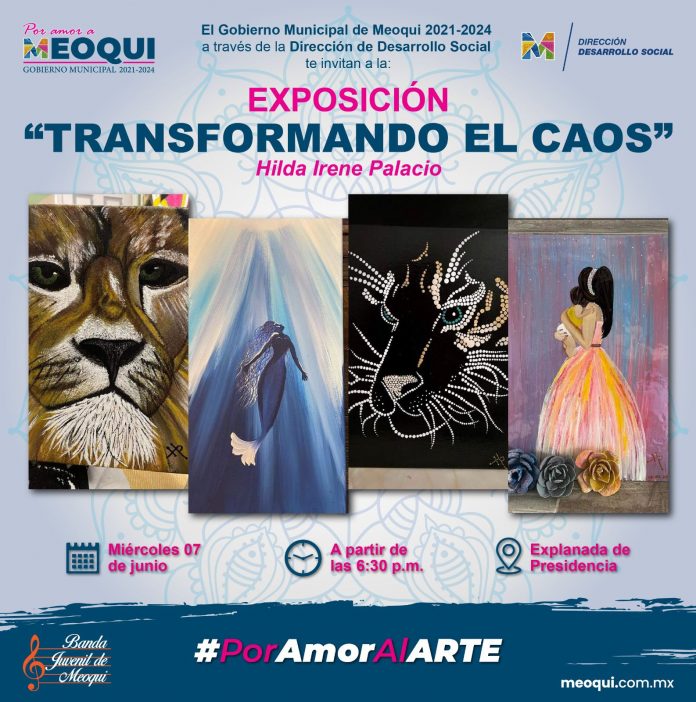 Meoqui.- Hoy se llevará a cabo el Programa Por Amor al Arte en la explanada de Presidencia de Meoqui a las 6:30 de la tarde, donde la artista Hilda Irene Palacio expondrá su galería “Transformando el Caos”, esto organizado por el Gobierno Municipal a través de Desarrollo Social, quienes hacen extensiva la invitación a la población en general para que disfruten de este evento.