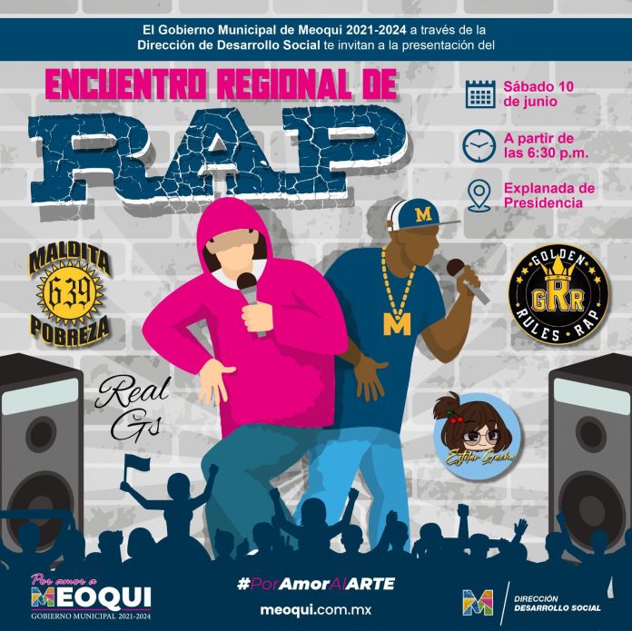 Meoqui.- Hoy en Meoqui se llevará a cabo el Encuentro Regional de Rap en punto de las 6:30 de la tarde en la explanada de Presidencia Municipal, donde raperos del municipio y la región brindarán una presentación totalmente gratuita, esto organizado por el Gobierno Municipal a través del Desarrollo Social, quienes hacen la invitación extensiva al público en general.