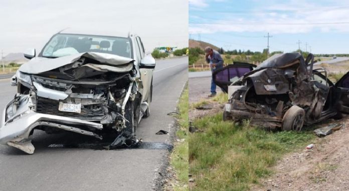 Delicias.- Un aparatoso choque se registró esta mañana en el kilómetro 202 de la carretera a Delicias. El accidente dejó como saldo a un copiloto con lesiones en la nariz. Lo trasladaron a un hospital para su mayor valoración médica.