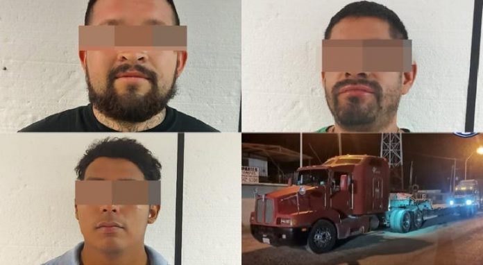 Jiménez.- Elementos de la Agencia Estatal de Investigación detuvieron a tres ciudadanos acusados de robar un tráiler de la marca Freightliner en el municipio de Jiménez, Chihuahua. Los sorprendieron en el término legal de la flagrancia.