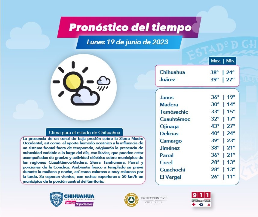 La dependencia estatal informó que hay posibilidad de lluvias moderadas a fuertes, con probable caída de granizo en municipios de las regiones occidente, sur y suroeste, como Cuauhtémoc, Guachochi, y Guadalupe y Calvo.