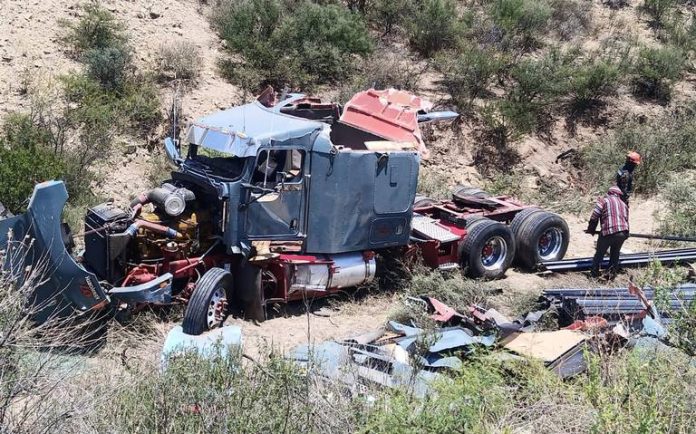 Parral.- Conductor de tráiler cargado con barras de metal perdió el control al volante y salió del camino, terminando su trayecto en volcadura en la carretera Vía Corta a Chihuahua; afortunadamente resultó ileso.