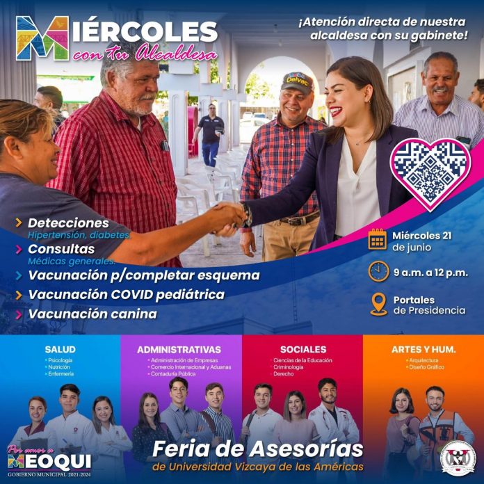 Meoqui.- Con Feria de Asesorías Académicas, Vacunación COVID Pediátrica, Defensoría Pública, consulta médica, vacunación antirrábica, detecciones, corte de cabello, entre otras, serán los servicios gratuitos que brindarán este “Miércoles con tu Alcaldesa” en los Portales de Presidencia Municipal de Meoqui, donde la arquitecta Miriam Soto y todo su gabinete estarán atendiendo de manera directa y sin previa cita a la ciudadanía desde las 9:00 am a 12:00 del medio día.
