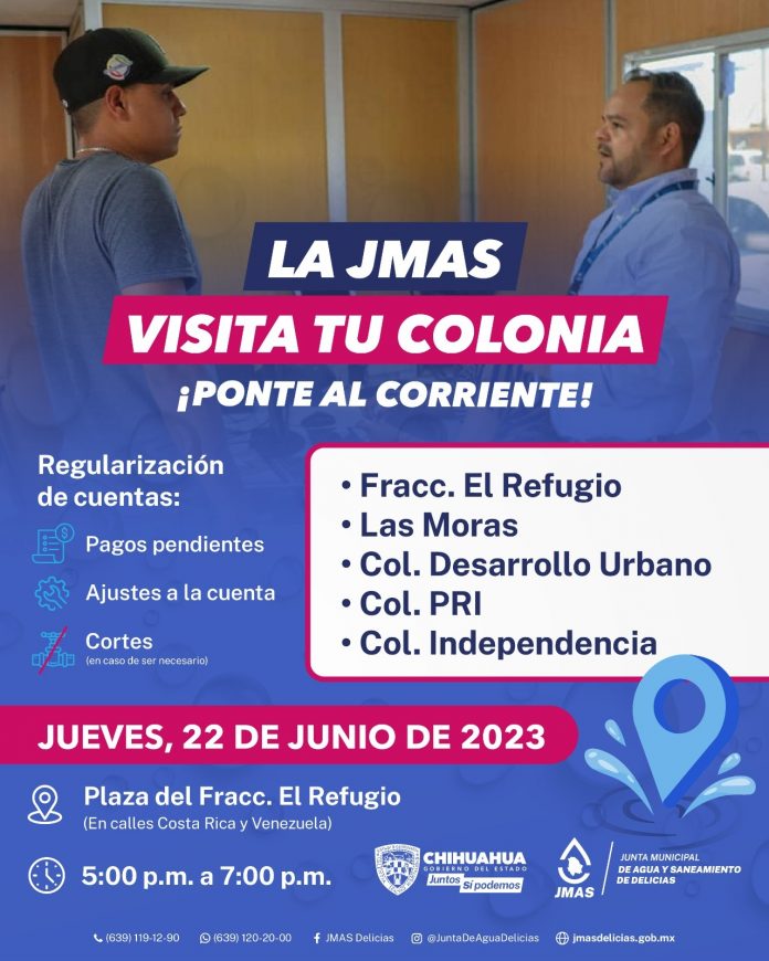 Delicias.- La Junta Municipal de Agua y Saneamiento, se acerca cada vez más a los usuarios que por motivos laborales no pueden acudir durante el horario de oficina. En esta ocasión, el programa “La JMAS Visita Tu Colonia” estará presente en el fraccionamiento El Refugio durante la tarde del jueves, con el objetivo de brindar servicios a los residentes del lugar y zonas aledañas.