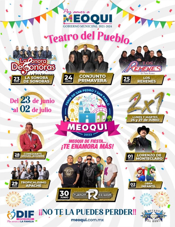 La Feria continuará el sábado 24 con la presentación de Conjunto Primavera, el 25 se presentarán Los Rehenes, el 26 y 27 será promoción entrada 2×1, el 28 se divertirán con el show de comedia de Miguel Aguirre, 29 Tropicalísimo Apache pondrá a bailar a todo Meoqui, el 30 Fuerza Regida con sus canciones virales, el 1 de julio Lorenzo de Montecarlo y se culminará el 2 de julio con la obra infantil de Mario Bros.