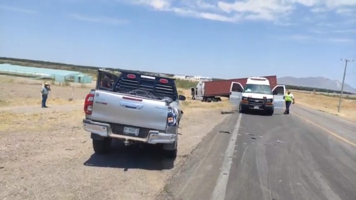 Del rancho Los González salía un vehículo Toyota Hilux de modelo reciente, el cual creyó que la circulación era libre y no en doble sentido, por lo que no se percató del tráiler antes mencionado y se dio el impacto.