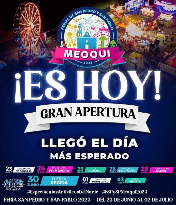 Meoqui.- La alcaldesa Miriam Soto, autoridades estatales y la región, darán arranque a la Feria San Pedro y San Pablo 2023 de Meoqui, con la bendición de esta gran fiesta, un recorrido por los stands, pasarela de candidatas a Reina, presentación de la Sonora de Sonoras y las Ferias Regionales de Productores de todo el estado.