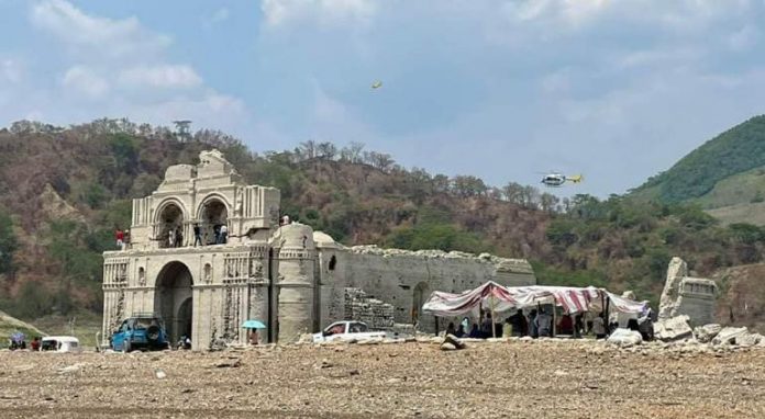 Chiapas.- Salieron a la superficie las ruinas de la iglesia Santiago Apóstol, en el municipio de Tecpatán, Chiapas, después de que la presa Malpaso baja su nivel 25 metros por la sequía.