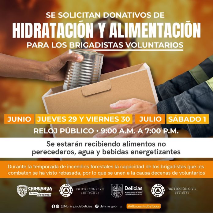 Delicias.- Con la intención de expresar el apoyo solidario de los delicienses, Protección Civil y Ecología invitan a la ciudadanía a apoyar a los brigadistas voluntarios que combaten el fuego en la Sierra de Chihuahua, a través de la recaudación de víveres.