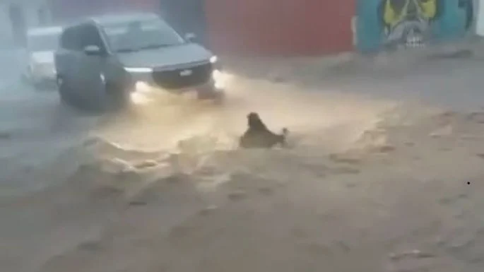 Un joven con una mochila caminó entre las aguas para intentar alcanzar a la menor de edad, quien hacía esfuerzos desesperados para tratar de evitar que la llevara la corriente.