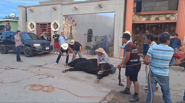 El toro finalmente fue sometido con ayuda de algunos vaqueros que acudieron para lazarlo, logrando inmovilizarlo.
