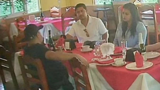 En una segunda imagen están sentados de frente, los separa una mesa familiar del local. A la derecha de la alcaldesa aparece su acompañante, y a su izquierda otra persona que no se aprecia por completo.