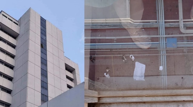 Usuarios de redes sociales publicaron un video en el que se ve el cuerpo del hombre tirado en uno de los techos del centro de salud, así como el vidrio que atravesó, el cual formaba parte del muro exterior.
