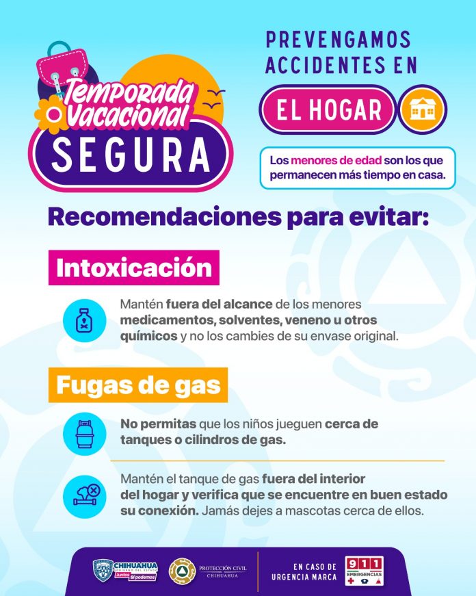 Chihuahua.- Con la llegada del periodo vacacional de verano, la Coordinación Estatal de Protección Civil (CEPC) dio a conocer a la población la importancia de seguir las medidas de prevención, para garantizar unas vacaciones seguras y libres de riesgos.