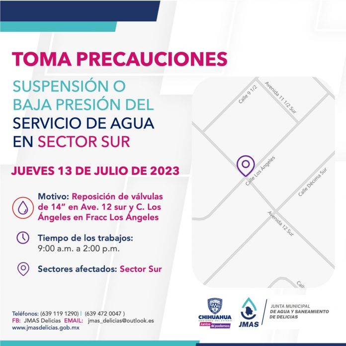 Delicias.- La Junta Municipal de Agua y Saneamiento de Delicias, informa a los usuarios del sector Sur ante una interrupción programada en el suministro de agua potable, así como una posible baja presión del servicio este jueves 13 de julio.