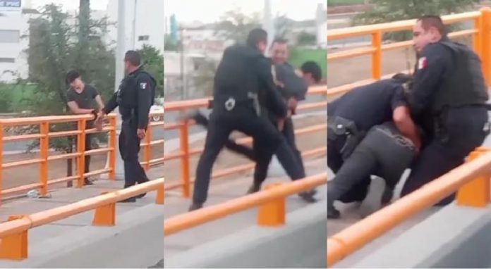 En las imágenes se apreció a dos elementos de la Policía Municipal, quienes se detuvieron tras recibir el reporte de estos hechos y comenzaron a dialgar con el joven. Adoptaron una postura relajada durante el procedimiento. Cuando el individuo se distrajo lo sostuvieron y jalaron rápidamente para ponerlo a salvo.