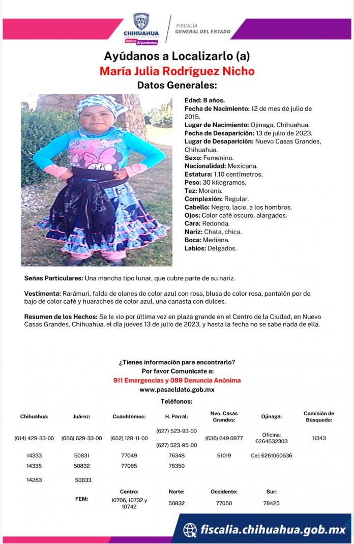 NCG.- La Fiscalía y familiares solicitan ayuda para encontrar a María Julia Rodríguez Nicho de 8 años, quien desapareció el 13 de julio del presente año mientras vendía dulces en la plaza grande de Nuevo Casas Grandes.