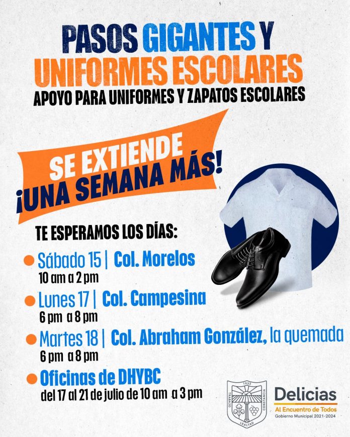 Delicias.- Debido a la alta demanda que se ha suscitado los últimos días para la solicitud del apoyo del de programa de Calzado y Uniformes Escolares, el sub director de Desarrollo Humano y Bien Común (DHyBC) Delicias, Ricardo Robles, anunció la extensión hasta el 21 de julio en la recepción de documentos.