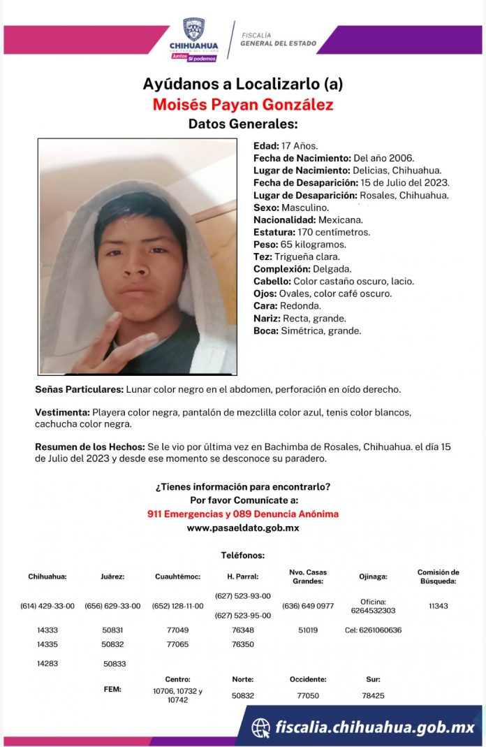Rosales.- La Fiscalía y familiares solicitan ayuda para encontrar a Moisés Payan González de 17 años, quien desapareció el 15 de julio del presente año en Bachimba de Rosales en el estado de Chihuahua.