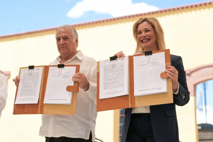 La gobernadora Maru Campos y el secretario de Turismo del Gobierno de México, Miguel Torruco, firmaron un convenio de colaboración para rehabilitar con pintura 140 viviendas y espacios públicos en la ciudad