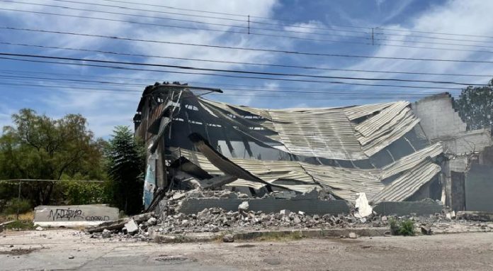 Los escombros quedaron sobre la banqueta de la calle Joaquín Terrazas, en la parte trasera de la maderería.