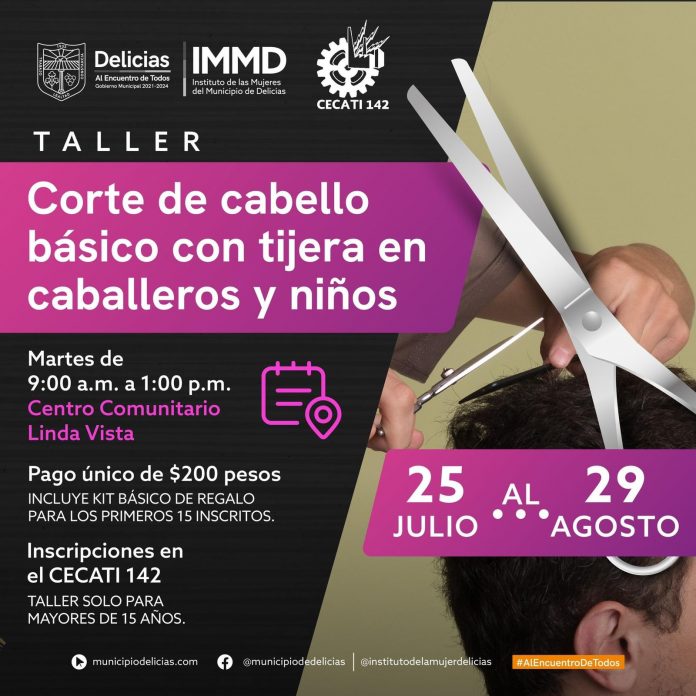Delicias.- Con la finalidad de apoyar a la economía familiar, Lorena Quezada, directora del Instituto Municipal de la Mujer Delicias (IMMD), invita al público en general mayores de 15 años, al curso de corte de cabello para caballero.