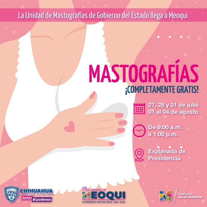Meoqui.- Este jueves arranca la atención gratuita con estudios de mastografías en Meoqui, así lo anunció la alcaldesa Miriam Soto, quien realizó las gestiones para traer la nueva Unidad Móvil de Gobierno del Estado, que estará instalada en explanada de Presidencia Municipal de 9:00 de la mañana a 1:00 de la tarde, por lo que Gobierno del Estado en coordinación con Gobierno Municipal, a través de Salud Municipal hacen la invitación extensiva a las mujeres mayores de 40 años para que aprovechen este estudio.