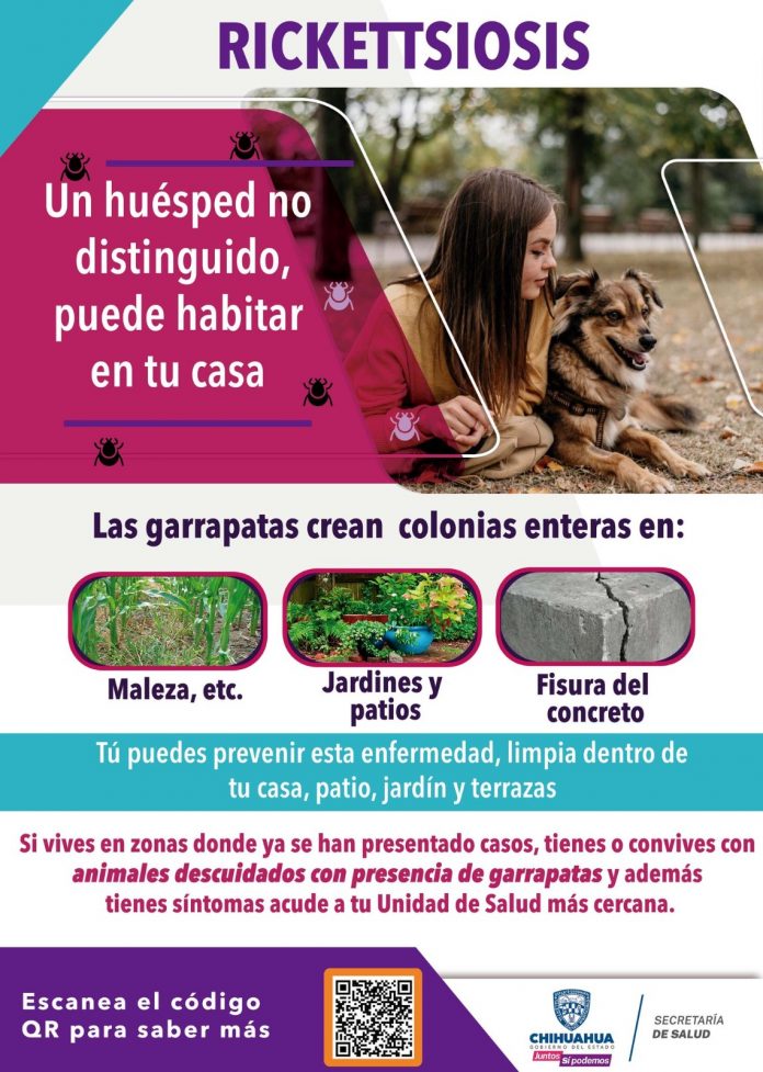 Chihuahua.- La Secretaría de Salud de Chihuahua, exhorta a la ciudadanía a reforzar las medidas de prevención ante el padecimiento de la rickettsiosis, como es la limpieza del hogar, patios y jardines, los cuidados pertinentes en las mascotas, así como la higiene personal en los integrantes de la familia.