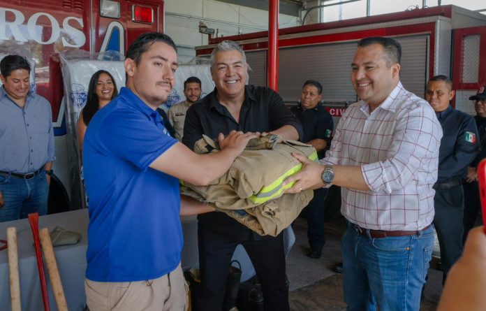 Delicias.- Con el afán de compartir y multiplicar los beneficios a los habitantes de la región Centro Sur, el Presidente Municipal, Jesús Alberto Valenciano, hizo la entrega de equipo de uso personal pantalón, chaquetón, guantes y botas, además de marros, llaves para hidrantes, picos, palas, mangueras y demás herramientas, a Bomberos de Rosales.