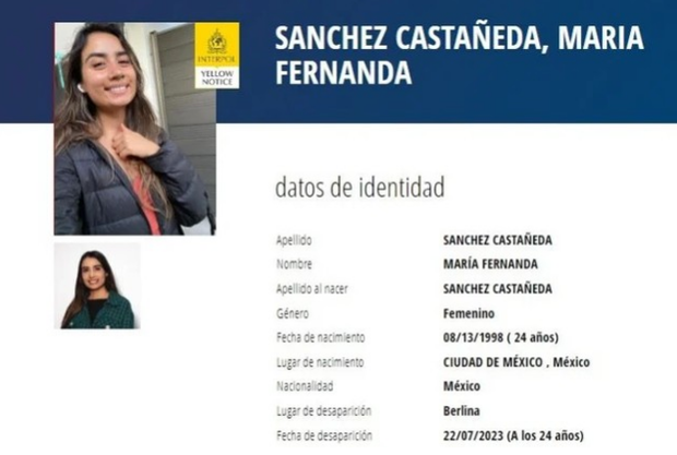 La Policía Internacional (Interpol) emitió la ficha de búsqueda de María Fernanda Sánchez, la mexicana de 24 años que está desaparecida desde el pasado 22 de julio en Berlín, Alemania.