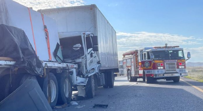 Un tráiler cargado con 25 toneladas de mármol circulaba en sentido de Delicias- Chihuahua a paso lento. Detrás de la unidad viajaba un camión de la empresa Logística Express, cuyo chofer no alcanzó a detenerse y colisionó en la parte trasera.