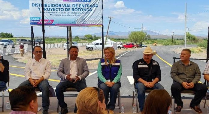 Julimes.- La Gobernadora Maru Campos Galván encabezó la inauguración oficial de un distribuidor vial en el municipio de Julimes.