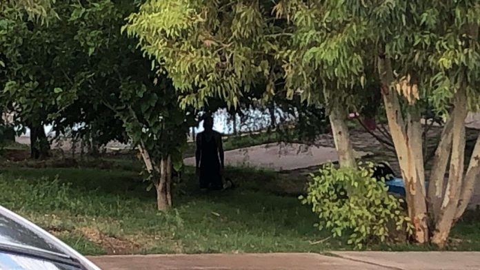 Dicha persona se encontraba con un mecate enredado en el cuello de rodillas vistiendo Short negro, playera de tirantes de color negro y una cachucha del mismo color.
