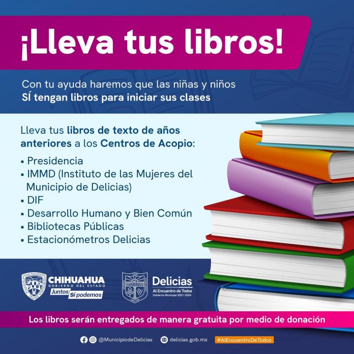 Ante esto, Enrique Valenzuela, director de Desarrollo Humano y Bien Común, informó que se recibirán los libros de texto del 2022 y anteriores, del nivel básico como primaria y secundaria, en las oficinas del DIF Delicias, del IMMD, DHyBC, biblioteca públicas y Estacionómetros, a fin de distribuirlos oportunamente a los estudiantes del ciclo 2023-2024.